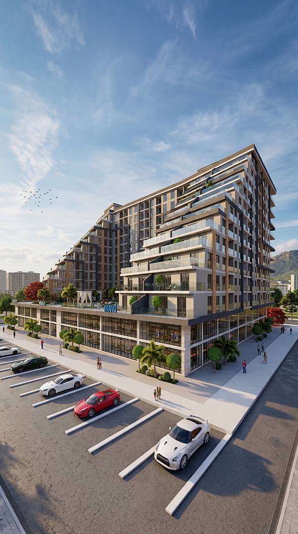 Ticari Alan (800 m²): Projenin zemin katında yer alan butik mağaza alanları; seçkin kafe, market veya hizmet noktalarına ev sahipliği yapacak şekilde planlanmıştır. 800 metrekarelik bu alan, site dışı yoğunluk yaratmadan, sakinlerin tüm temel ihtiyaçlarını "bir asansör mesafesinde" karşılamasını sağlar.